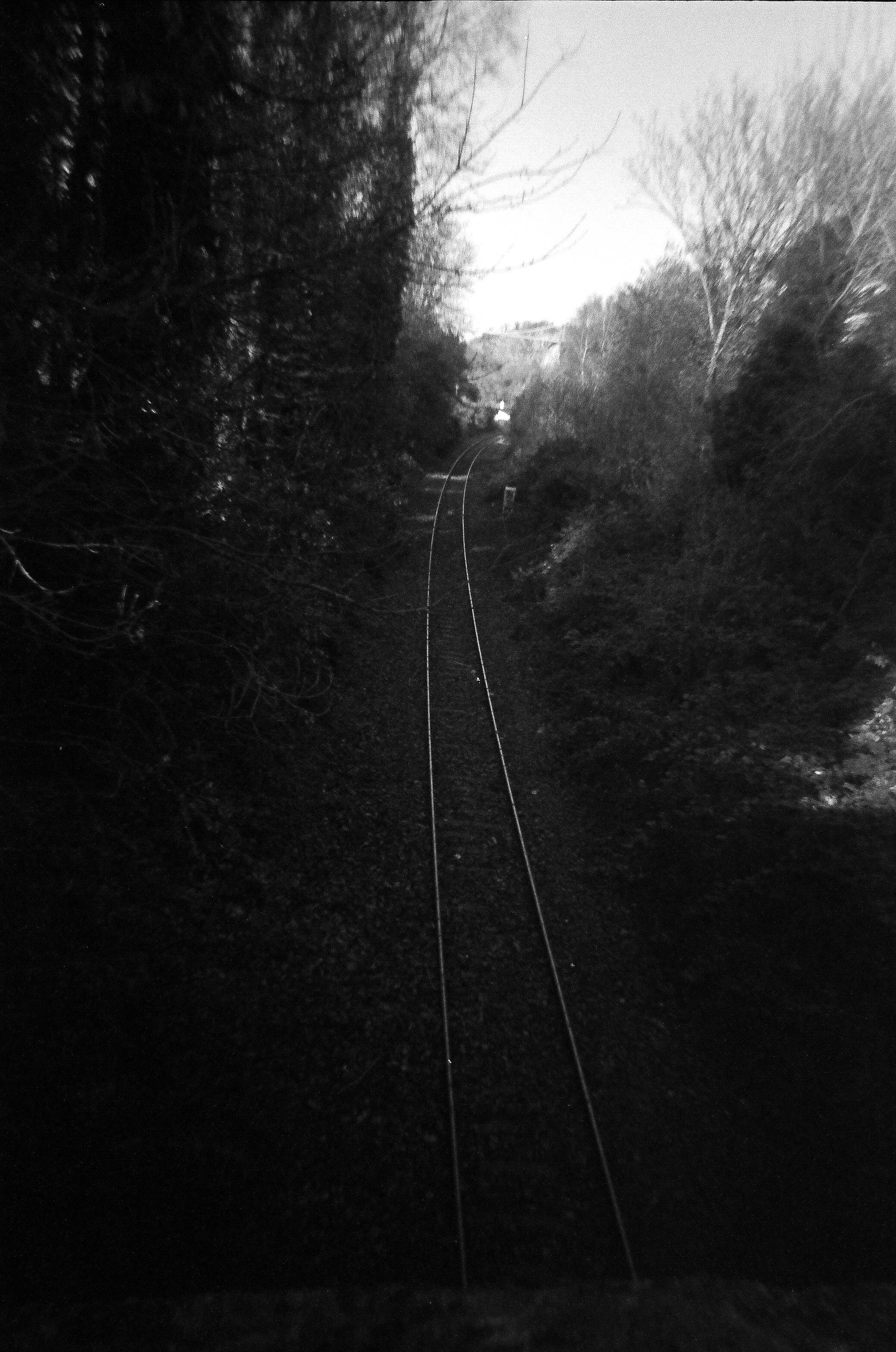 Black and white photo of a forested railway track curving into the distance, with trees on both sides and a cloudy sky above.